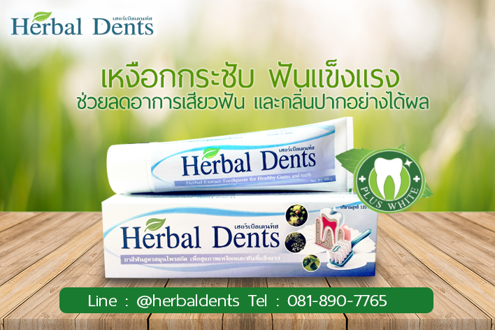 - ยาสีฟันสมุนไพร เฮอร์เบิลเด้นท์ส Herbal Dents มีสารสกัดสมุนไพรให้ความสะอาดทั่วทั้งปาก เหงือกกระชับ ฟันแข็งแรง ช่วยลดอาการเสียวฟัน และกลิ่นปากอย่างได้ผล ทำให้ปากสะอาด หอม เย็น สดชื่น มั่นใจได้ตลอดวัน